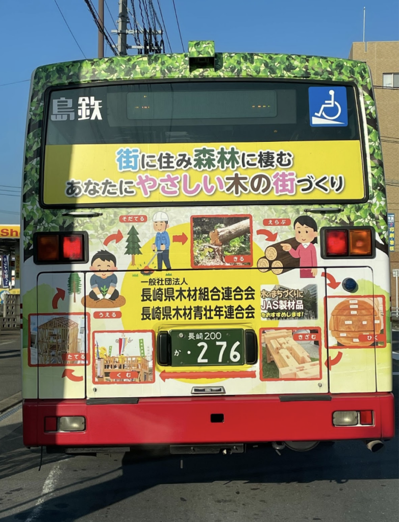 この、ウッディーレターの取材を受けるタイミングで、長崎県内を長崎県木材組合連合会様と長崎県木材青壮年連合会がコラボして取り組んだラッピングバス、路面電車合わせて9台が走行しています。