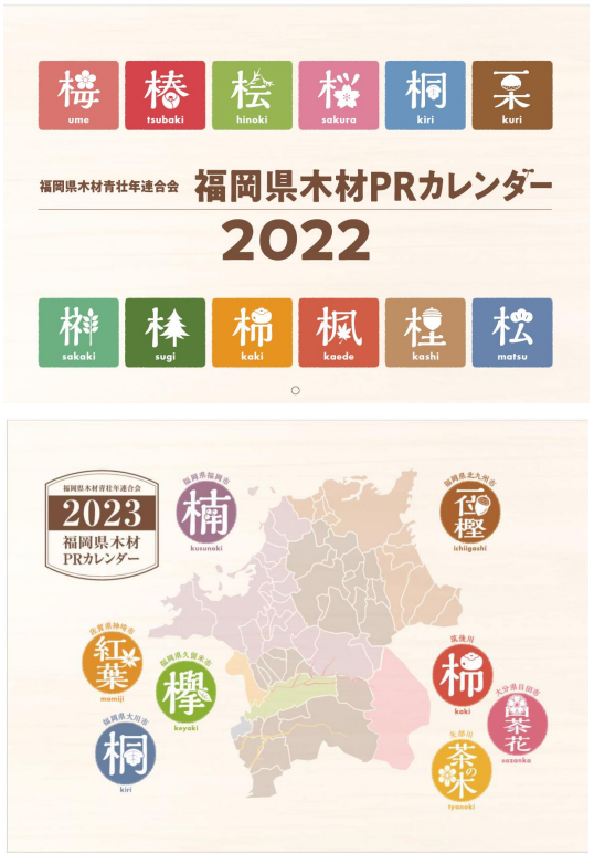 福岡会団は、5つの会団と4名の特別正会員からなる会団ですが、それぞれの地域性があります。本年度は日本木青連の木材PRカレンダーが見直しとなりましたので、福岡県独自で木材PRカレンダーが出来ないか協議を重ねて、それぞれの地域性を活かした、福岡県ならではの木材PRカレンダーを作成することができました。出来上がったカレンダーは、木工工作コンクールの受賞者や各小学校に配布させて頂いております。