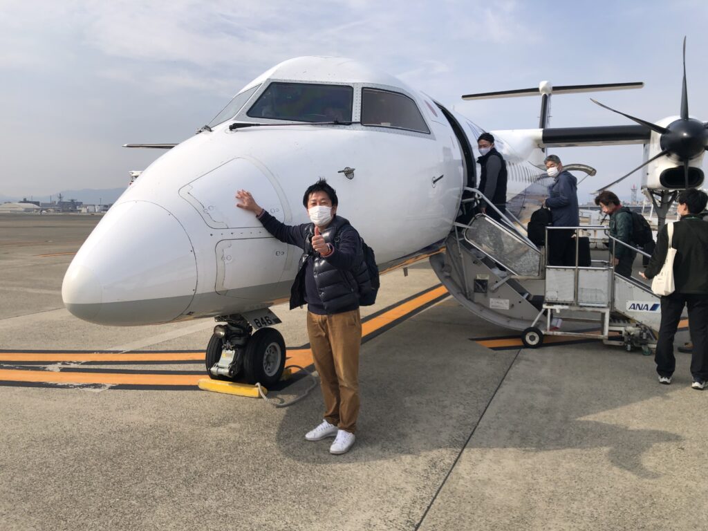スタッフは大会前日の3月11日から対馬に入りました。対馬へは、長崎と福岡からプロペラ機で乗り込みます。小さな飛行機で約30分のフライトで対馬に到着しました。