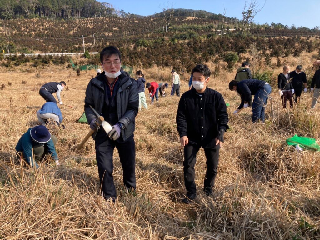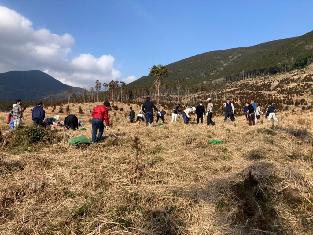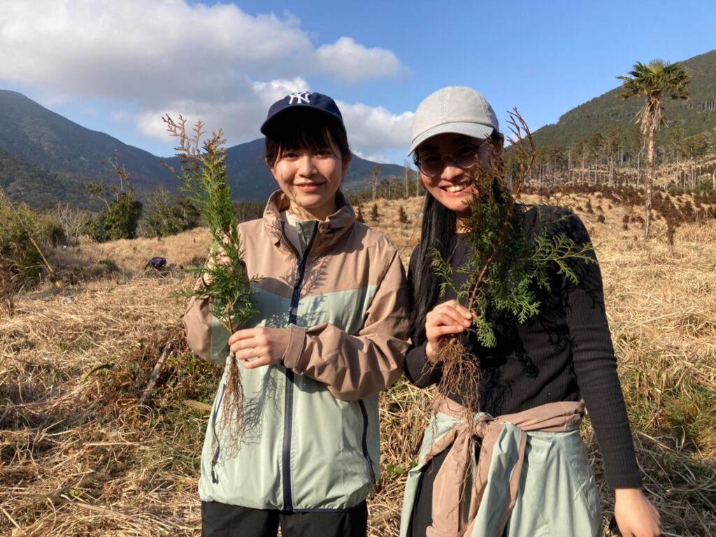 すっきりと洗練された大会式典は山のなかで執り行われました。式典の後は、大学生による創作準備運動ののち、植林を行いました。つしまひのきの苗木300本を植林しました。