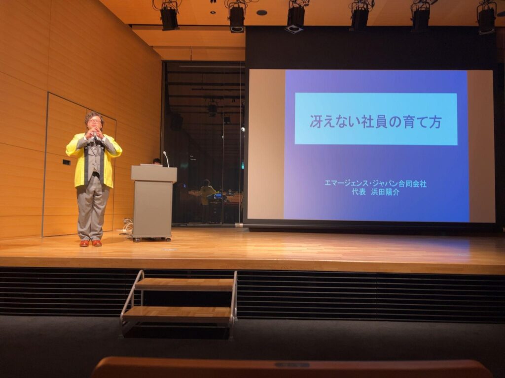 第1部では、人材育成コンサルタントの浜田陽介さんを講師に迎えて、「さえない社員の育て方~社員を動かす影の力を追い払え~」と題して講演を頂きました。