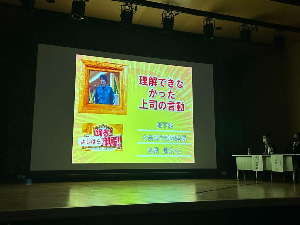そこでは、大会実行委員長の岡本さんが何としてもやりたいと貫き通して実現した、会員出演の再現VTRが披露されました。これが非常に面白かったです。