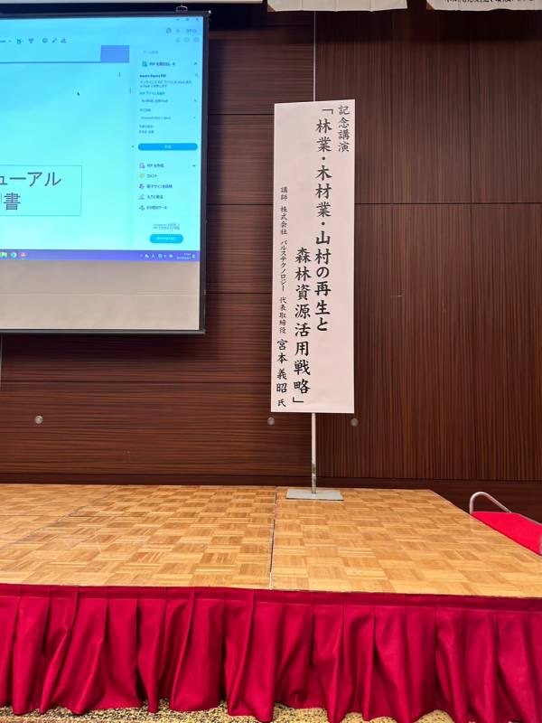記念講演では宮本義昭様をお招きし「林業、木材業界、山村の再生と森林資源活用戦略」というテーマでお話いただきました。