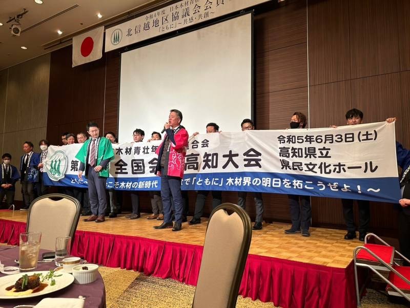 その後、次回開催地の次期地区長長野県木材青壮年団体連合会、田中博文君よりご挨拶をいただき、締めくくりました。