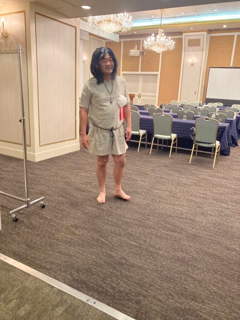 会長の挨拶では青森県開催ということで世界文化遺産に登録された北海道・北東北の縄文遺跡群の縄文人になりきった、寺島 信弘君が登壇し会場は笑いの渦に包まれました。