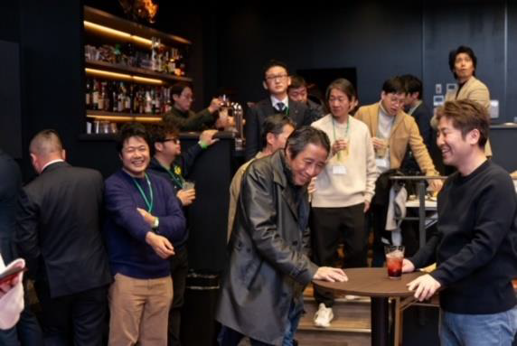 懇親会では石川県会団長 梶谷会員の挨拶、石川県中小企業青年中央会 長坂様の乾杯で始まりました。会場にはバーカウンターが設営されおり、飲み物を自ら取りにいくスタイルが会員同士の距離を近くし交流を活発にさせ和やかな雰囲気の中時間が流れました。その後、Kamin(上村さや香)のアコギ演奏、福田マイケル会員の聖闘士星矢熱唱、バンド演奏で会場の雰囲気は最高潮、その勢いのまま令和7年5月24日に開催される、全国会員関西大会のPRを吉田委員長が中心となり行っていただきました。