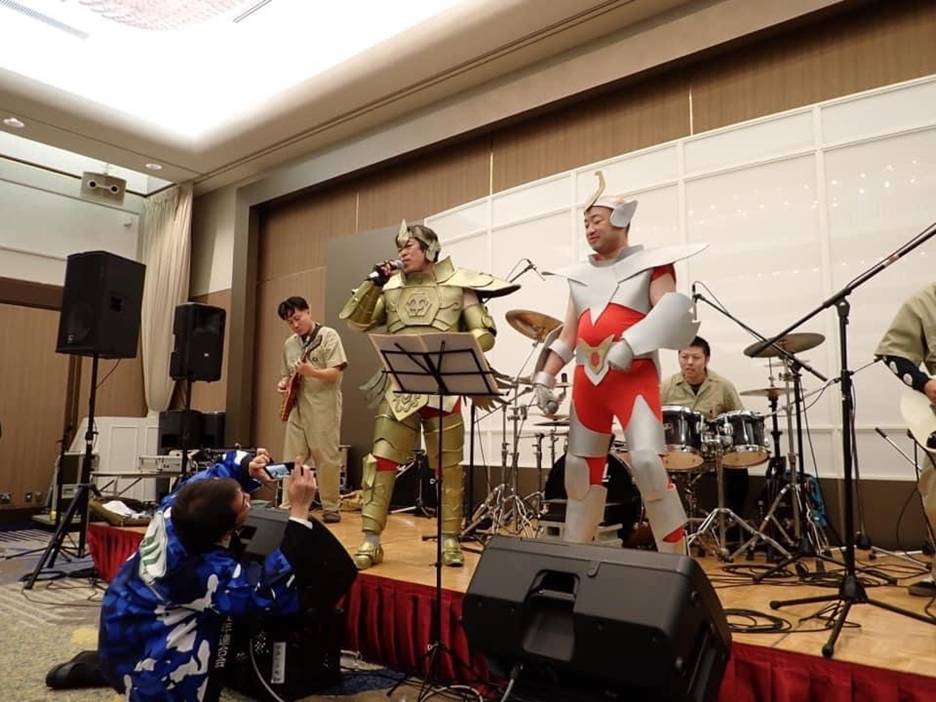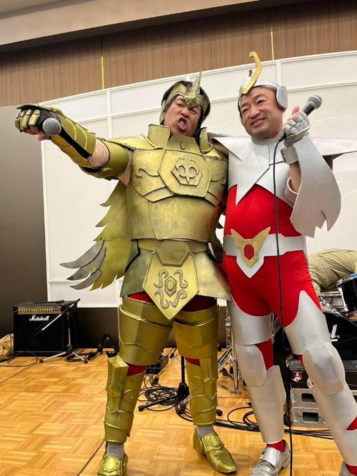 懇親会は、日本木青連の全国大会PR、アイドルLIVEと進んでいきます。そして、ついに待ちに待った「マイケル聖闘士星矢LIVE」の時間がやってきました、会場に鳴り響く音楽に乗って登場したのは聖闘士星矢!、、、ではなくラオウ姿のマイケル会長!!北斗の拳LIVEの熱気に誘われ北海道地区の山本地区長(じゅんじゅんさん)も飛び込みでラルクを熱唱!いよいよペガサスマイケル会長の登場かと思いきや、なんとゴールドクロス姿のマイケル会長に会場からどよめきが起こりました!最後はペガサスじゅんじゅんさんも登場し「木青連の歌LIVEバージョン」で会場が一体となりました。
